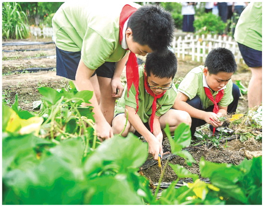 当日,在浙江省嘉兴市南湖区新丰镇中心小学的校园农场内,学生们参加收番薯、除草、浇水等特色劳动课程,开启新学期的“开学第一课”。新丰镇中心小学是浙江省拓宽校外劳动实践途径试点学校,依托校园农场形成了特色鲜明的劳动课程。
