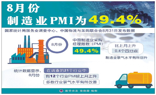 “8月份,制造业PMI回升至49.4%,在调查的21个行业中,有12个行业PMI较上月上升,多数行业景气水平有所改善。”国家统计局服务业调查中心高级统计师赵庆河说。