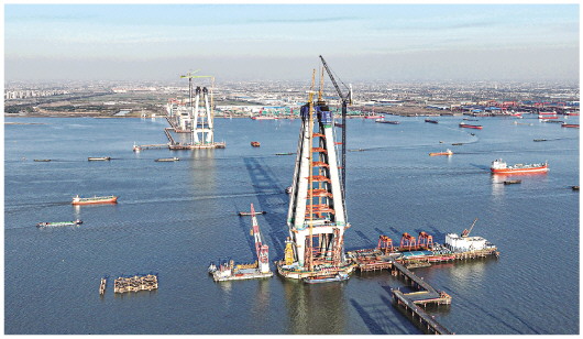 12月19日,常泰长江大桥6号主塔已施工至32节,主塔高度突破200米。常泰长江大桥是长江上首座集高速公路、城际铁路、普通公路“三位一体”的过江通道,连接江苏省的常州市与泰州市,建成后将成为世界上跨度最大的斜拉桥。 新华社发(陈暐摄)