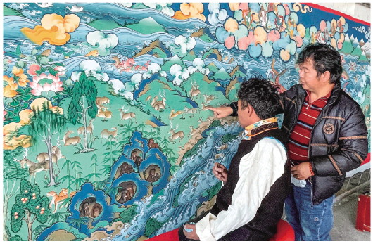 西藏勉萨画派非遗传承人西落(右)正在和他的学生绘制新题材唐卡“百匠唐卡·千米画卷”(12月19日摄)。 新华社发 |