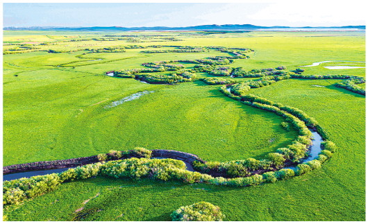 这是6月12日拍摄的乌拉盖草原。初夏时节,位于内蒙古自治区锡林郭勒盟东北部的乌拉盖草原风景宜人,蔚蓝色的天幕下,绿色的草原广阔无垠,蜿蜒流淌的乌拉盖河绵延向远方,美如画卷。 新华社记者彭源摄