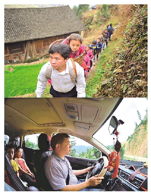 ▲上图:在广西龙胜龙脊镇江柳村,江柳村翁江小学唯一的老师在放学路上将一个走不动了的孩子背在背篓里,领着其他孩子一起回家(2013年2月26日摄);下图:余启贵开着自己的汽车带着学生去学校(2020年7月7日摄)。新华社记者陆波岸摄 |