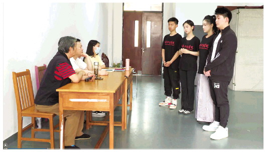 ▲任课老师刘俊杰(左一)、王彤(左二)点评曲艺相声本科班生的基本功。