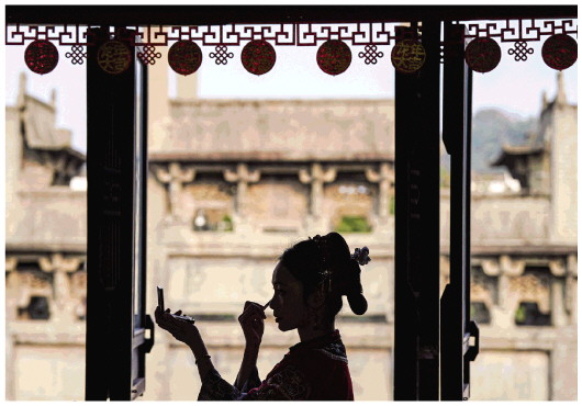 ▲1月10日,在安徽省黄山市歙县徽州古城,演员方芳在演出前化妆。在徽州古城,有一群主要由当地“00后”组成的演艺团体,他们从古徽州历史和民间故事中取材,通过精巧的剧作和行进式的表演方式,推出原创沉浸式话剧演出《徽州府有喜》,为文化的传承和发展注入新活力。