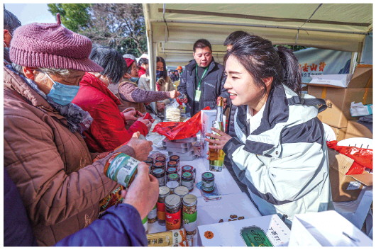 ▲1月6日,浙江省杭州市淳安县枫树岭镇下姜村党总支书记姜丽娟(右)在下姜村的展位前介绍本村的特色农产品。