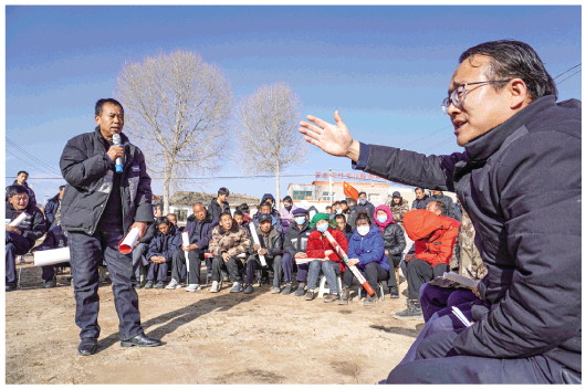 ▲1月17日,在宋家沟村灾后重建协商会上,乡镇干部(右)为村民解答问题。