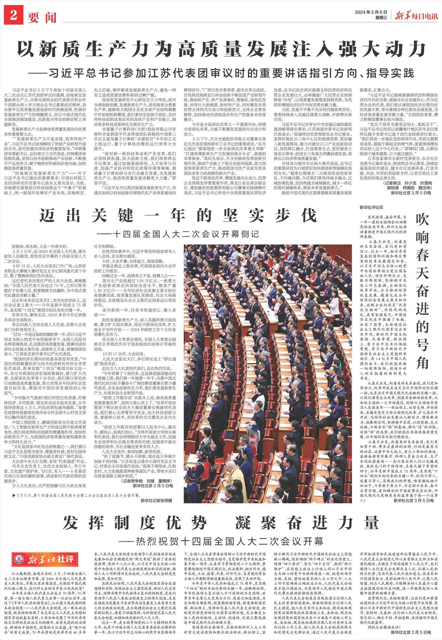 习近平总书记5日下午参加十四届全国人大二次会议江苏代表团审议时强调,因地制宜发展新质生产力。出席全国两会的代表委员和会外干部群众深入学习领会总书记重要讲话精神,表示要牢记高质量发展是新时代的硬道理,把握好发展新质生产力的精髓要义,在以中国式现代化全面推进强国建设、民族复兴伟业的新征程上再建新功。