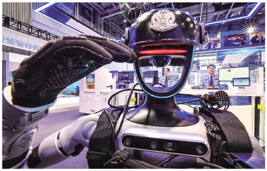 ▲5月14日,在第十二届中国国际警用装备博览会移民管理装备展区,具身人形智能警务机器人在举手敬礼。