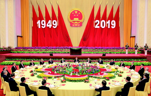 在喜庆欢快的乐曲声中,中外宾朋举杯共贺中华人民共和国成立70周年,祝福中国繁荣富强,祝愿中国同世界各国友谊长青,共创幸福美好未来。