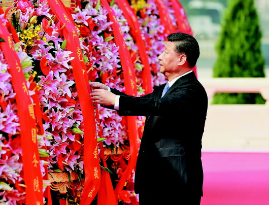 ▲9月30日上午,习近平、李克强、栗战书、汪洋、王沪宁、赵乐际、韩正、王岐山等党和国家领导人来到北京天安门广场,出席烈士纪念日向人民英雄敬献花篮仪式。这是习近平整理花篮上的缎带。