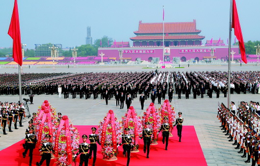 纪念碑前,4000多名各界代表手持鲜花,列队肃立。他们中有年逾九旬的老战士、老同志,有胸前佩戴着红飘带的烈士亲属,有国家勋章和国家荣誉称号获得者代表,有参加全国民族团结进步表彰大会的代表,有朝气蓬勃的青年学生和少年儿童。