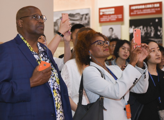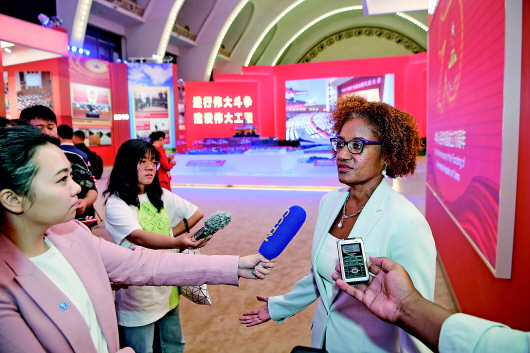 新中国成立70年以来的光辉历程,许多外国友人既是见证者、亲历者,也是参与者、支持者。沿着展厅内的红色地毯一路参观,库利科娃和玛亚姆的记忆“穿越”回过去。