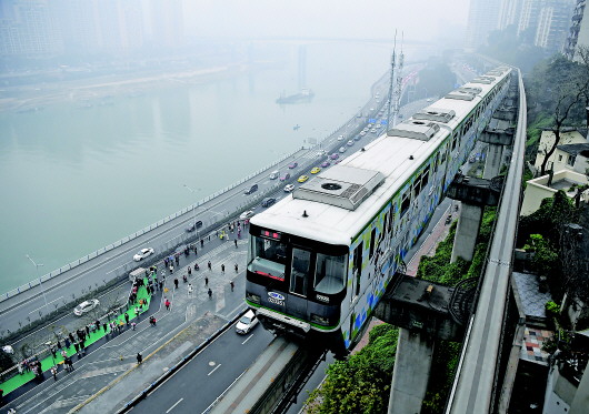 跨座式单轨几乎是为重庆建设轨道交通量身打造。爬坡能力上,一般地铁的最大坡度在30%左右,跨座式单轨的爬坡能力轻松可达50%,理论坡度可达100%。转弯半径上,地铁的最小转弯半径在300米左右,跨座式单轨的转弯半径却只有100~150米。而在造价上,仅相当于地铁造价的三分之一左右。跨座式单轨是橡胶轮胎骑行在钢筋混凝土轨道梁上,不会像钢轮钢轨相互摩擦那样发出轰鸣声。跨座式单轨还具有景观性好、节能降耗等优势,恰好与重庆山多坡陡、道路崎岖、人口密集和发展旅游经济的特点高度契合。