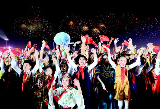 今晚,千歌万曲汇成一种表达——歌唱祖国;今晚,千山万水回荡一个声音——人民万岁。