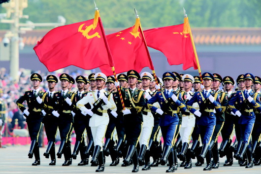 党旗、国旗、军旗,迎风飘扬——