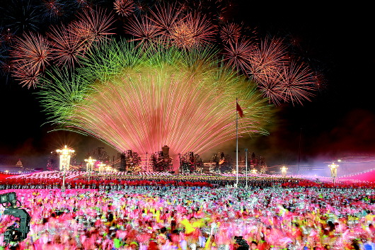 张艺谋说:“为致敬人民,我们首次特别制作高难度特效焰火——‘人民万岁’,三次连续绽放,配以手持烟花、音乐烟花和各种新型礼花,使天地交相辉映,铺展出一幅欢乐祥和的盛世图景。”