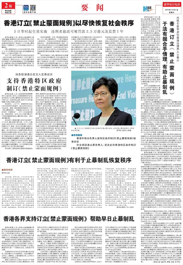 香港订立《禁止蒙面规例》有利于止暴制乱恢复秩序 |