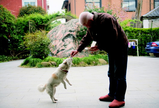 在浙江省杭州市余杭区瓶窑镇港东村,76岁的王嘉宝在院子里把吃剩的菜用来喂狗(3月29日摄)。该村有十多位“抱团养老”的老人,每天一起逛街买菜、跳舞、打麻将,如同多年老友。