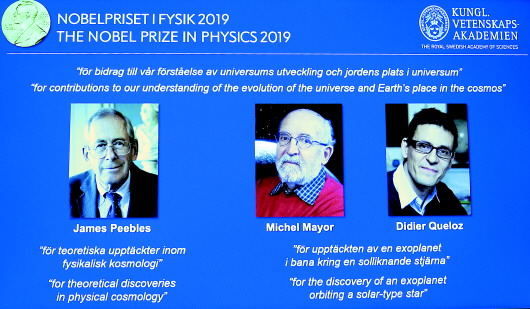 新华社斯德哥尔摩10月8日电(记者和苗、付一鸣)瑞典皇家科学院8日宣布,将2019年诺贝尔物理学奖授予三名科学家。来自美国的詹姆斯·皮布尔斯因宇宙学相关研究获奖,来自瑞士的米歇尔·马约尔和迪迪埃·奎洛兹因首次发现太阳系外行星获奖。