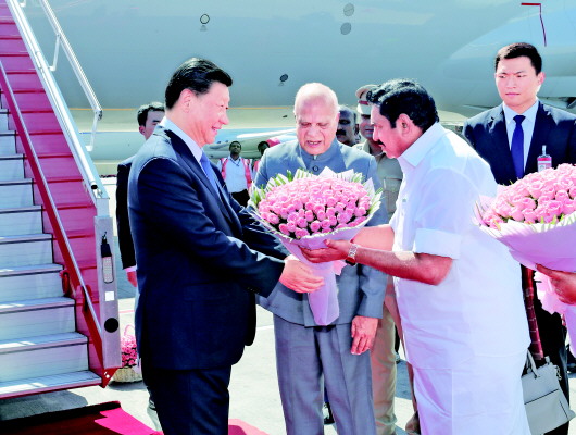 10月11日,国家主席习近平乘专机抵达金奈,应印度共和国总理莫迪邀请,出席中印领导人第二次非正式会晤。印度泰米尔纳德邦邦长普罗希特、首席部长帕拉尼斯瓦米等在舷梯旁迎接,向习近平敬献鲜花。