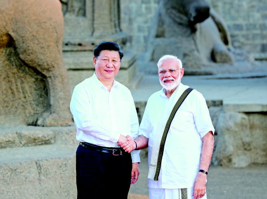 在深邃星空下的海岸神庙,面对着浩瀚无际的印度洋,习近平和莫迪畅谈中印各自国内发展,交流治国理政经验,一致认为,中印要相互尊重、相互学习、相互借鉴,携手实现共同发展繁荣,实现中印两大文明伟大复兴。