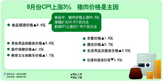 尽管9月当月CPI涨幅有所扩大,但1至9月平均CPI比去年同期上涨2.5%,走势总体温和,也低于全年3%左右的调控预期目标。但当前物价上涨的结构性特征比较明显。9月份,非食品价格同比涨幅回落、服务价格涨幅温和,但猪肉价格同比上涨69.3%,对CPI上涨的“贡献”超过一半。此外,牛肉、羊肉、鸡肉、鸭肉和鸡蛋价格也有不同程度上涨。