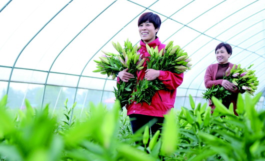 ▲10月16日,河北省南和县郝桥镇南郝村村民在温室大棚内采摘百合。