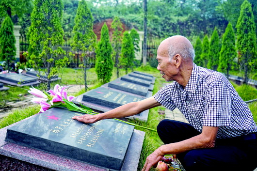 林广东带着家人在于都烈士纪念园缅怀叔叔林罗发生(9月4日摄)。 新华社记者赖星摄