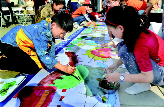 ▲10月19日,少年儿童在长卷上进行“全民安防”主题创作。