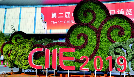 10月21日,工人在国家会展中心(上海)西入口处张贴进博会标志。目前,进博会场馆装饰施工工作正在进行。 新华社记者方喆摄