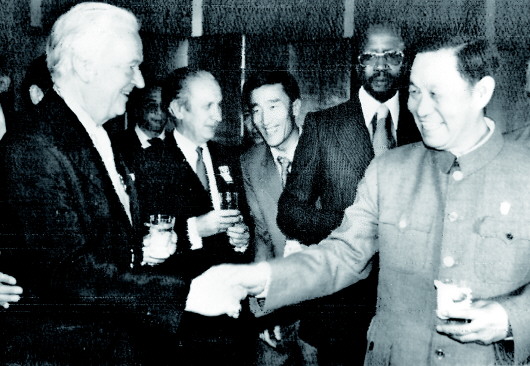 1979年10月25日,国际奥林匹克委员会执委会在日本名古屋决定恢复中华人民共和国在国际奥委会的合法席位后,基拉宁主席(左)同中国奥林匹克委员会秘书长宋中(右)握手祝贺。 新华社资料图