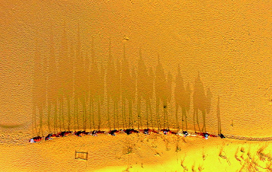 10月26日,游客骑着骆驼在新疆尉犁县罗布人村寨内欣赏沙漠美景。金秋十月的塔里木盆地,金色胡杨迎来最美季节。 新华社记者赵戈摄