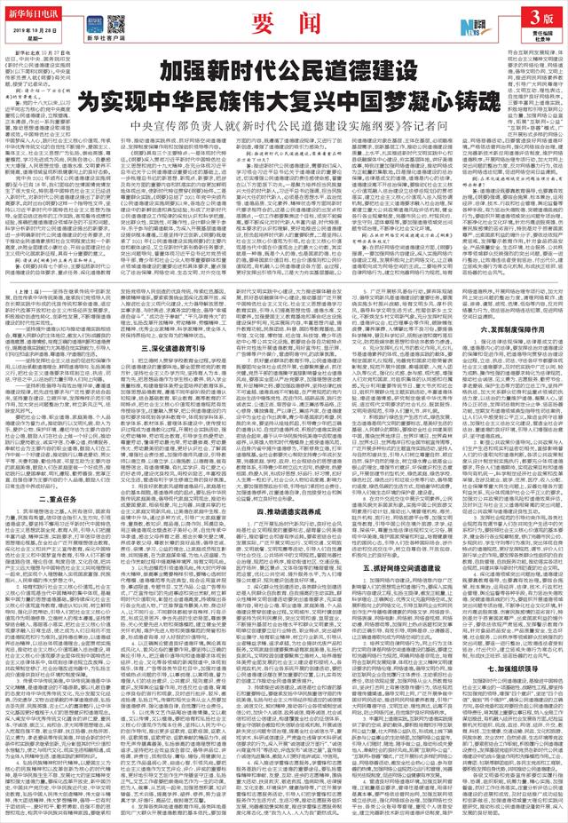 新华社北京10月27日电近日,中共中央、国务院印发了《新时代公民道德建设实施纲要》,并发出通知,要求各地区各部门结合实际认真贯彻落实。