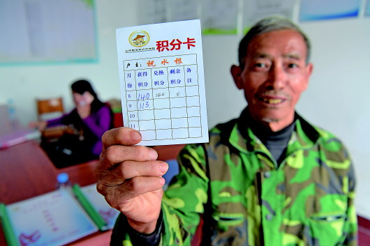 近日,在南昌市湾里区罗亭镇义坪村的“脱贫动力加油站”,一位村民展示他的积分卡。村里的贫困户只要参与村容治理、义务劳动等,就可换取积分兑换商品。新华社记者彭昭之摄