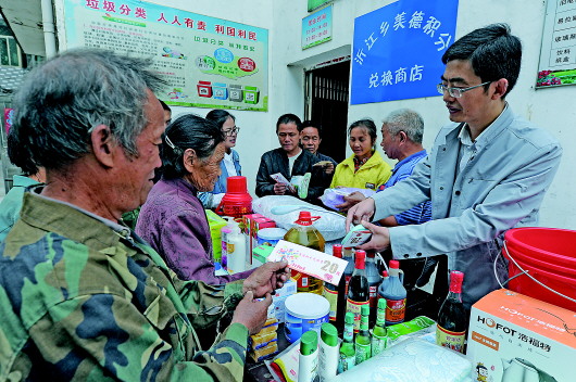 近日,在江西省新干县沂江乡浒岗村委会湖尾村,贫困户用“美德积分券”兑换生活用品。新华社记者冯为民摄