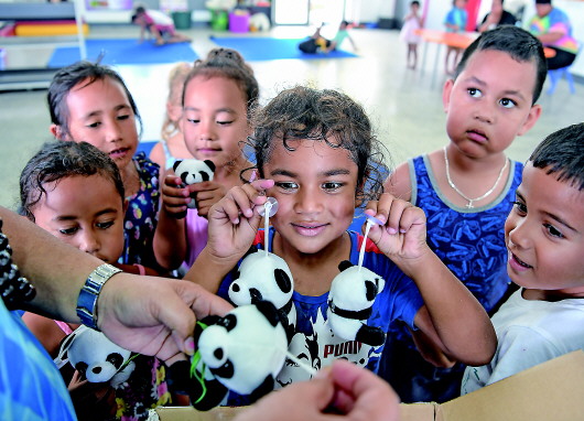 10月26日,在库克群岛首都阿瓦鲁阿的阿皮尼考学校,幼儿园的孩子手拿来自中国的熊猫挂件。