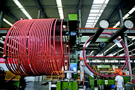 在生产车间内,一个“大块头”正在不断“吐出”铜管。副总经理张建军指着它说:“我们在芬兰技术的基础上,增加了这项‘二联拉’技术,成材率从40%提升至80%。”