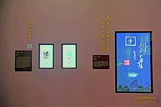 国博的甲骨文文化展虽没有这么跌宕起伏的故事做注解,但融入信息时代特色的展示手段同样为“科普”增色。赵永说:“观众有兴趣来看很重要,但一般的甲骨都很小、很脆,观赏性并不强。再就是看不懂文字,这个不是看看展板就能理解透的。所以做了一些多媒体的东西,包括甲骨文表情包、手绘甲骨文吉利话、全息甲骨文宇宙等。”