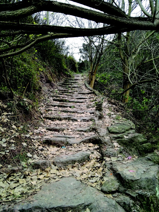路只有两尺来宽,一边是山坡,一边是田地,依山势用条石砌成台阶状。没有多少人走,茅草将路覆盖了大半,腿在草中迈动着,只听得唰拉唰拉响。在黄葛树那儿已能望见长江,此时越往下走,越觉得前面的那排山像一堵大墙,不仅挡住了视线,还让人觉得路到那儿就会消失。可峰回路转,先是两座崖壁间闪出一道缝,小溪上架着一座小石拱桥。李约瑟来后曾在回忆登山的文章中记载过这座小桥。小桥精致又沧桑,不过也覆满了茅草,不认真看,肯定会忽略。看资料说,这里石壁上好像还有座小佛龛,是保佑虔诚的上山人好运的,但不知是不是茅草盖了,我没看到。
