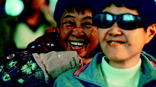 阅兵开始,他们身边的志愿者开始轻声讲解银幕上的场景。为了给这些特殊观众讲好电影,志愿者们要准备好几天,有的人要花4个小时转三趟车赶到这里。