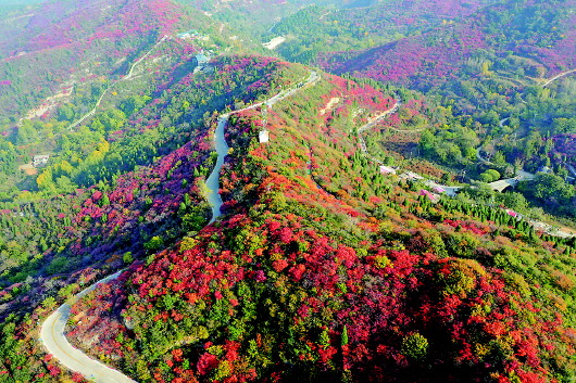 金秋时节,河南省巩义市竹林镇长寿山的红叶进入观赏期,吸引游人前来休闲观光。