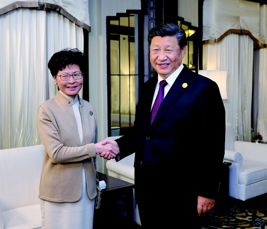 11月4日晚,国家主席习近平在上海会见出席第二届中国国际进口博览会的香港特别行政区行政长官林郑月娥。新华社记者鞠鹏摄