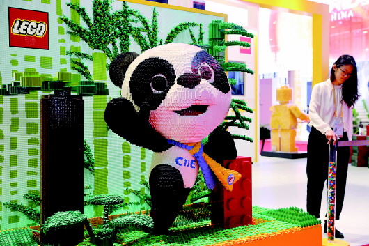 ◥11月3日,在品质生活展区的乐高展台,用积木搭成的进博会吉祥物熊猫“进宝”已安装就绪。