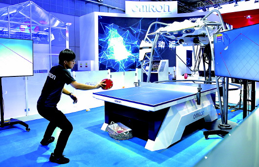 ▲11月4日,工作人员在欧姆龙自动化(中国)有限公司展台测试打兵乓球的机器人。