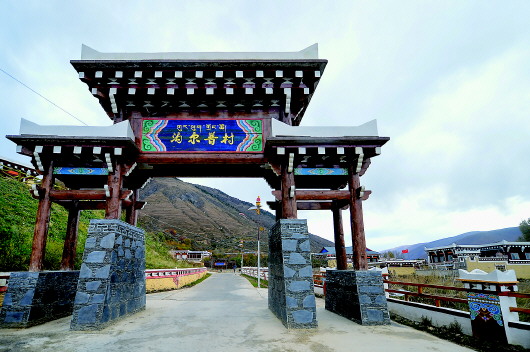 ▲四川省甘孜藏族自治州道孚县麻孜乡沟尔普旅游新村入口(10月31日摄)。 新华社发(唐文豪摄)