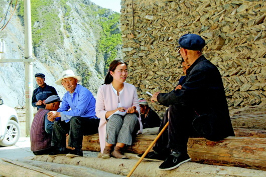 图1:舟曲县扶贫办副主任张小娟(右二)在下乡时向群众了解情况(2018年4月摄)。均为新华社发