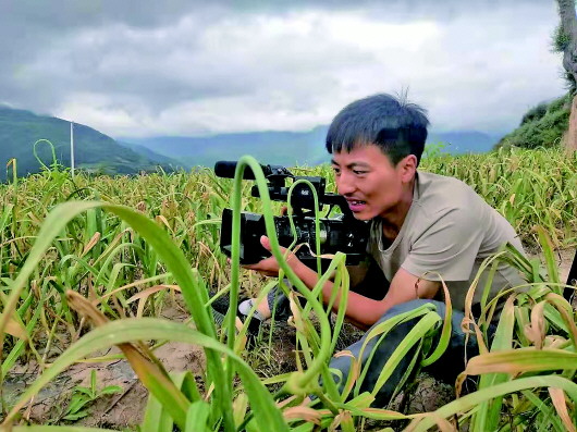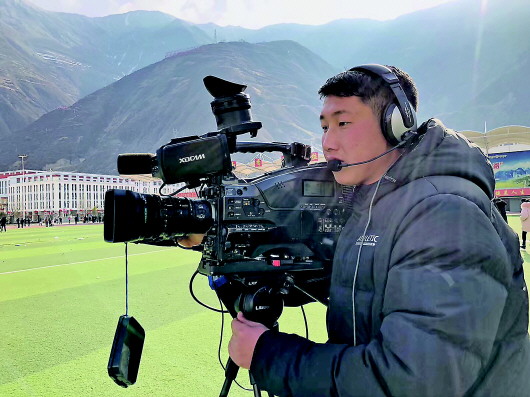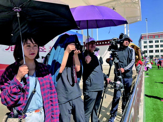 图4:闵江伟在2019年舟曲县春节民俗文化活动现场参加现场直播(2019年2月14日摄)。
