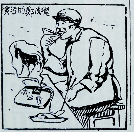 此事被揭露后,《红色中华》在第134期发表了一幅《贪污分子郑德茂》漫画,画中戴着五角星帽子用“办公费”大吃大喝的郑茂德,脑海里正想着一匹骡子,贪污分子的丑陋形象跃然纸上。