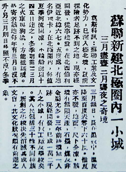 1933年1月,《红色中华》一则《苏联新建北极圈内一小城三月尽昼三月尽夜之奇境》的消息,向读者介绍了伊加卡的情况。