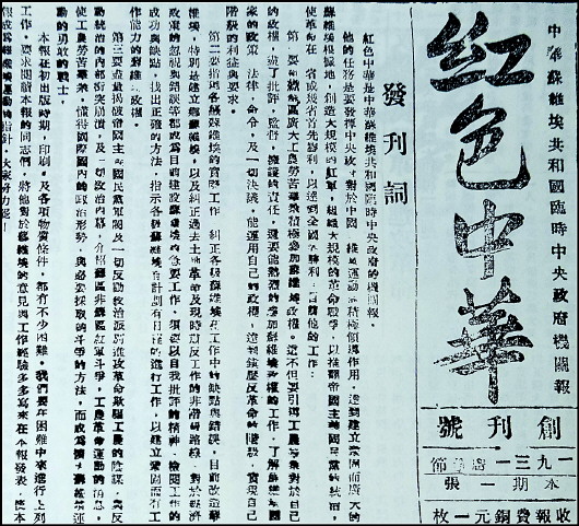 一个月后的12月11日,中华苏维埃共和国临时中央政府机关报《红色中华》创刊。1932年2月4日起,《红色中华》改为中国共产党苏区中央局、中国共产主义青年团苏区中央局、中华苏维埃中央政府、全总苏区执行局合办的中央机关报。